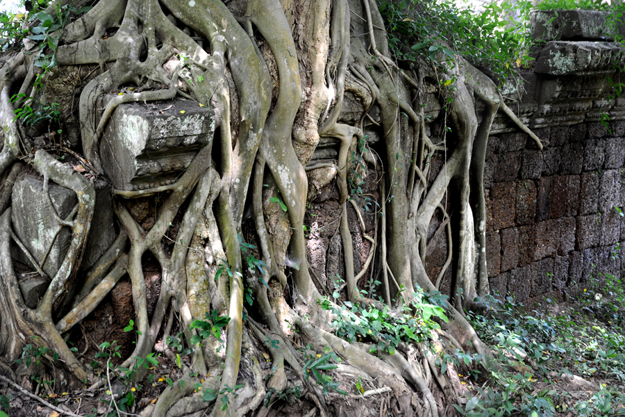 East of Angkor there is a huge compound called Chau Srei Vibol. A group of buildings in ruins is on top of a small natural hill. One tree cracked the northern enclosure wall, its roots on the north side of this wall can be seen on the photo.